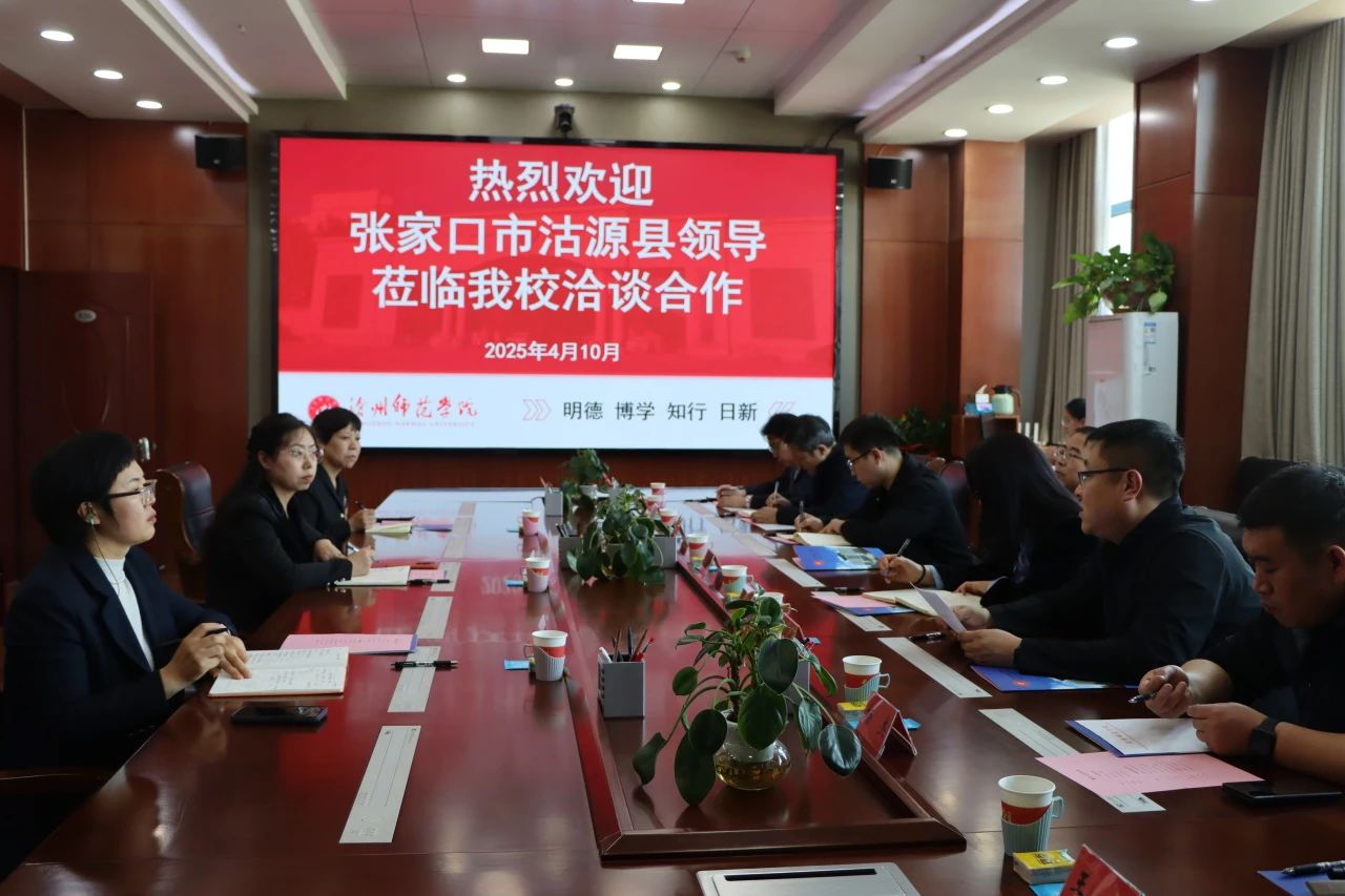 4月10日下午,张家口市沽源县人大常委会副主任于海清、沽源县政府副县长刘芬、县政府办公室副主任于志达、教育局局长赵学礼一行8人到新葡萄官网洽谈合作,党委常委、副校长郭玉秀出席并主持会议。教务处处长何兰芝、副处长李婷婷参加会议。