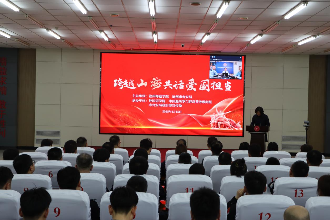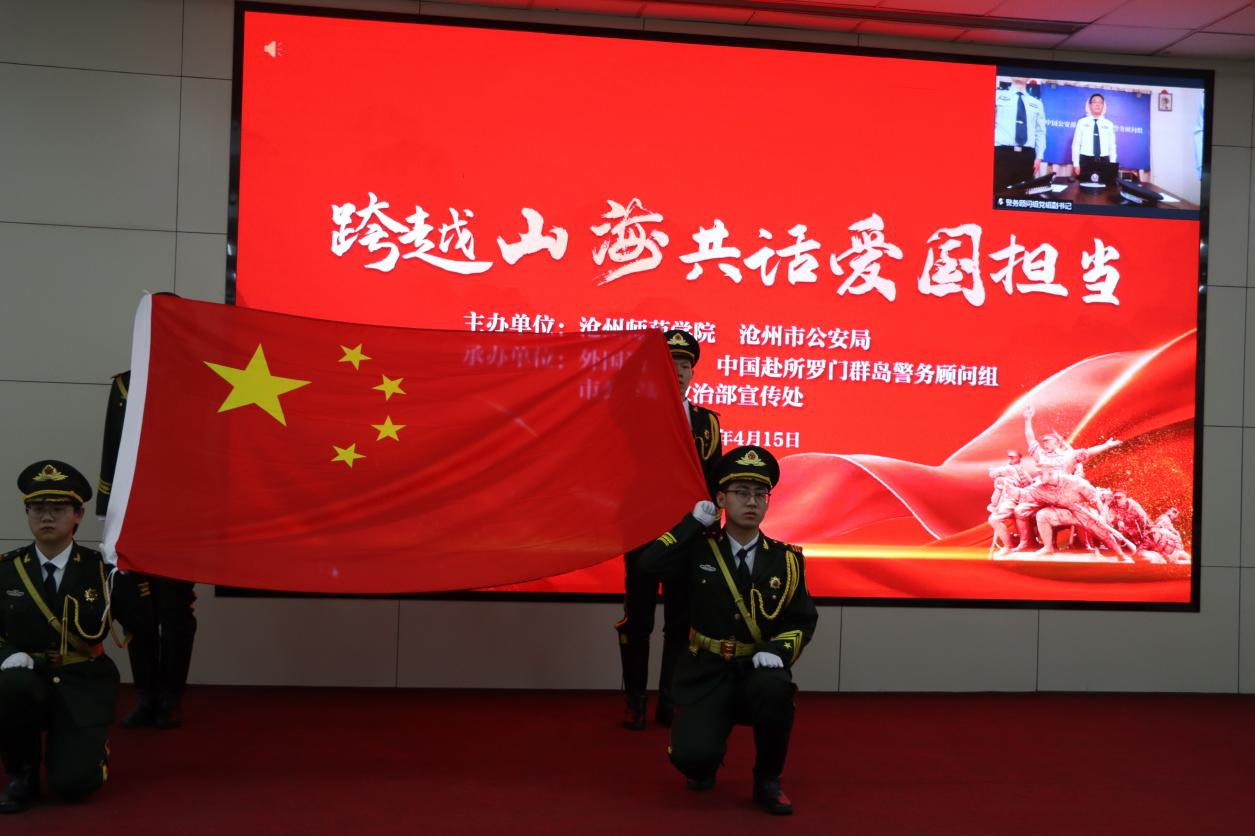 本次活动以“跨越山海,共话爱国担当”为主题,由新葡萄官网和市公安局主办,新葡萄官网外国语学院、中国赴所罗门警务顾问组、市公安局政治部宣传处承办。中国赴所罗门群岛警务顾问组党组副书记、副组长、沧州市公安特警支队党委书记、支队长葛建军,中国赴所罗门群岛警务顾问组成员、公安部特勤局一级警长刘子葭,公安部特勤局一级警长金浩与师生在线交流。沧州市特警支队负责人、政保支队政委齐立伟,市局政治部副主任、宣传处处长高志熙,运河区、新华区、高新区、开发区各分局分管领导以及新葡萄官网党委副书记范小振,党委常委、副校长高颖出席活动。