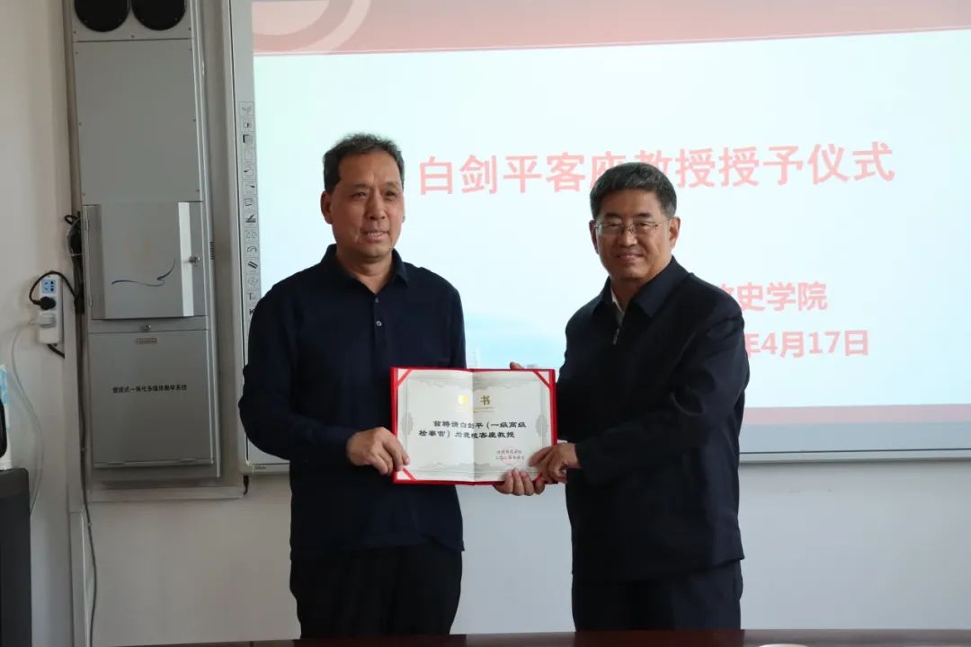 “法援+高校”共建 ,“教育+实践”共融。4月17日下午,白剑平客座教授授予仪式在新葡萄官网政史学院会议室举行。新葡萄官网党委副书记范小振为沧州市法律援助志愿者、退休检察官白剑平颁发客座教授聘书。沧州市司法局副局长曲凤云,沧州市法律援助中心主任及元戎,沧州市法律援助中心工作人员以及新葡萄官网政史学院负责人、师生代表共同见证。