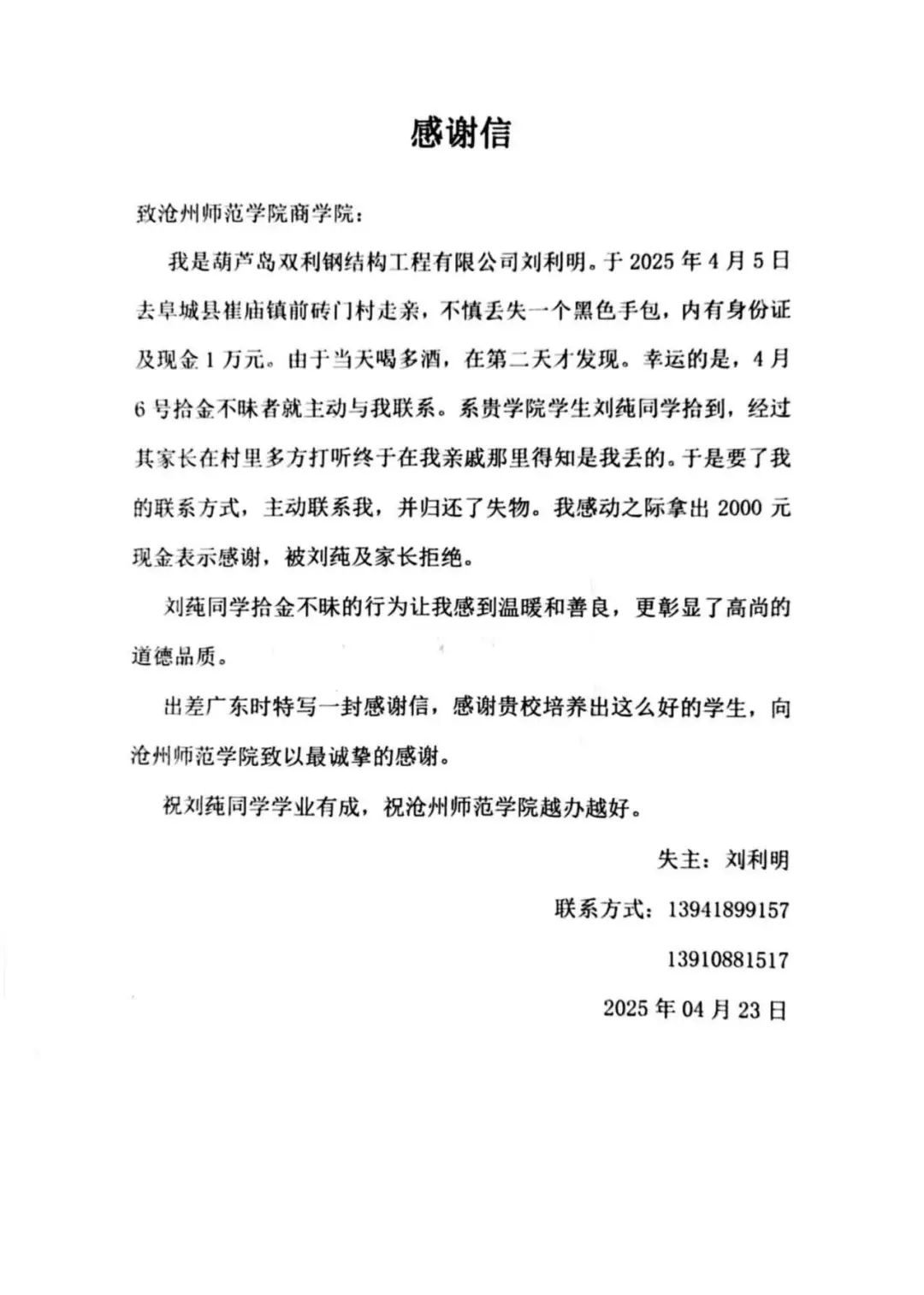 清明假期期间,新葡萄官网商学院酒店管理专业大二学生刘莼回到老家衡水阜城县崔庙镇前砖门村。在村头停车场,她发现了一个遗落的黑色手提包。刘莼在原地等待半个多小时,仍未有人前来认领,担心物品遗失,刘莼决定先将包拿回家中,并同家长一寻找失主。 刘莼和家长打开包后发现,里面有整齐的万元现金和身份证等。通过多方打听,刘莼家长找到了失主联系方式,系外地来走亲的刘某,确认失主身份后,将包原物奉还。失主激动万分,拿出2000元现金表示答谢,被刘莼和家长婉拒了。刘莼表示:“我捡到的时候连包里有什么都不清楚,只想尽快找到失主。得知包里有那么多现金后,我想失主肯定十分着急更得抓紧联系。这对他来说是物归原主,对我来说是举手之劳。” 失主被刘莼同学的行为深深打动,特意给学校寄来了感谢信,信中对刘莼的高尚品德给予了高度赞扬。
