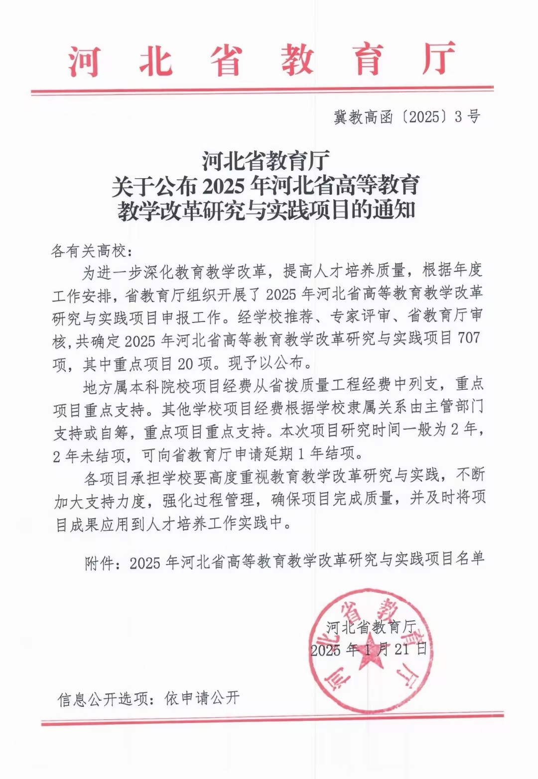 近日,河北省教育厅发布了《河北省教育厅关于公布2025年度河北省高等教育教学改革研究与实践项目的通知》(冀教高函〔2025〕3号),新葡萄官网推荐的10项教育教学改革研究与实践项目经过专家评审和教育厅审核,成功获得立项。