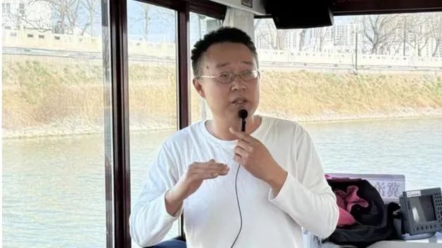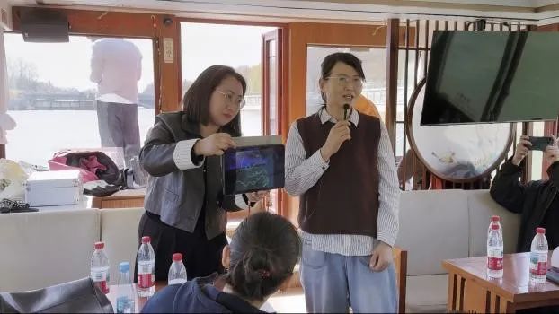 沧州运河本土文化专家宫瑞梅在游船上为师生讲解大运河的历史文化。宫瑞梅详细介绍了大运河的历史变迁,指出大运河不仅是一条重要的水上交通要道,更是一条文化纽带。它连接了南北不同的地域文化,促进了经济、文化的交流与融合,孕育出了大运河的漕运文化、码头文化、民俗文化等中华民族宝贵的精神财富。