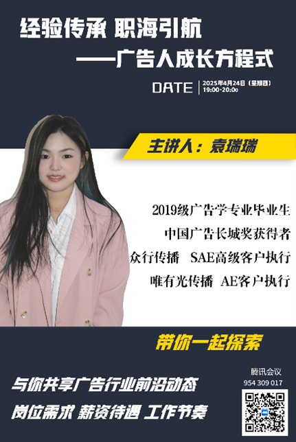为深入贯彻落实产教融合战略,充分发挥校友资源优势,构建校友与在校生长效互动机制,助力学生精准把握行业动态、科学规划职业发展,4月至5月,由齐越传媒学院主办、广告学教研室承办的“师哥师姐说·经验传承 职海引航——广告人成长方程式”系列线上讲座活动成功举办。活动通过邀请四位扎根于不同领域的优秀毕业生,为在校生带来了关于行业前沿、职场实战与个人成长的宝贵分享,活动反响热烈。 启动仪式:寄语未来,锚定方向 4月24日晚7点,系列讲座首期活动在线上平台开启。齐越传媒学院党总支书记潘治钢出席启动仪式并致辞。潘治钢高度肯定了此系列活动的深远意义,他指出:“齐越传媒学院始终致力于学生的成长与发展,积极对接优质资源,构建党建引领下的‘产学研’一体化育人平台。从行业大咖到校友导师,每一场分享都是连接校园与职场的坚实桥梁。‘经验传承 职海引航’活动主题精准体现了广告专业‘以行业需求为导向’的办学理念。”他殷切期望同学们通过持续学习,努力成为具备敏锐洞察力、卓越创造力和高效执行力的新时代广告人才。学院副院长安琪、广告学教研室主任于园园及教研室全体教师全程参与了系列活动。 四期精彩:多元视角,深度解码 本次系列讲座汇聚了广告学专业四位优秀校友的智慧结晶,每期聚焦不同职业领域,为师弟师妹们奉上了丰盛的“职场成长秘籍”: 首期:解码客户执行,启航职场之路 由2019级毕业生、中国广告长城奖获得者袁瑞瑞主讲。袁瑞瑞结合自身经历,系统分享了客户执行岗位的核心业务范畴、典型工作节奏、代表性项目案例、薪资结构及清晰的晋升通道,并提供了极具实操性的职业规划建议。互动环节气氛热烈,在校生就实习、考研就业抉择等踊跃提问,袁瑞瑞耐心解答,令参会学生收获满满。副院长安琪对袁瑞瑞的倾囊相授给予高度评价。