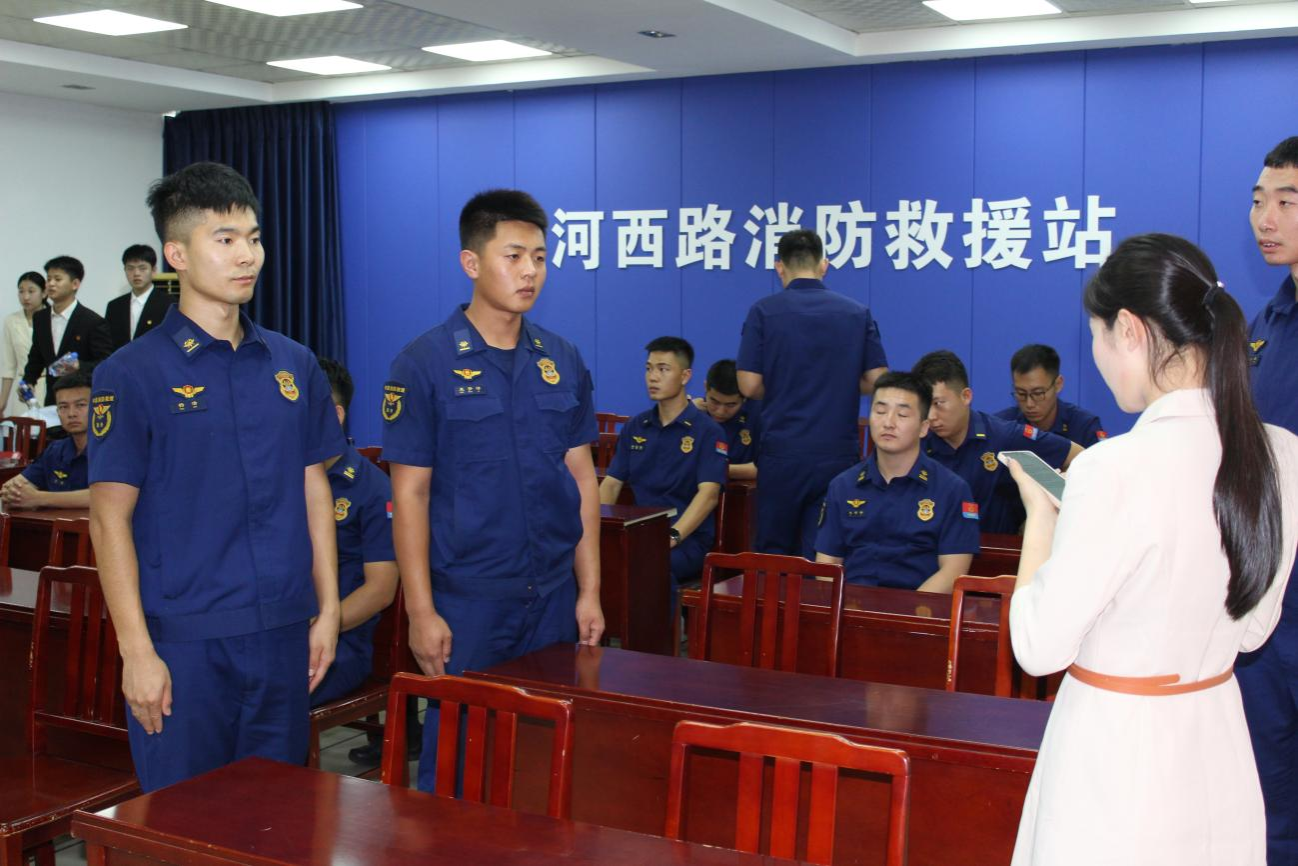 九河西路消防救援站站长徐磊、指导员刘大鹏对宣讲团的成员们进行了接待,他们表示,九河西路消防救援站高度重视本次活动,青年学生与基层工作者相互学习,有助于推动党的创新理论在基层落地生根,更体现了新时代青年挺膺担当的社会责任。