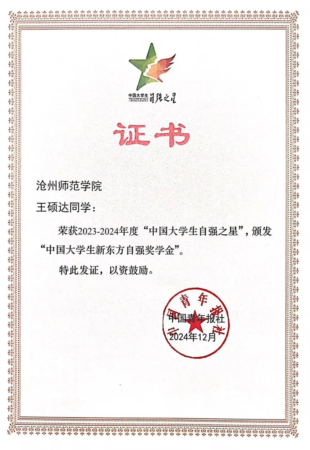 近日,共青团中央、全国学联指导、中国青年报主办,东方教育科技集团、中国青年创业就业基金会协办的2023-2024年度“中国大学生自强之星”评选结果揭晓,马克思主义学院思想政治教育专业王硕达同学荣获“中国大学生自强之星”称号。