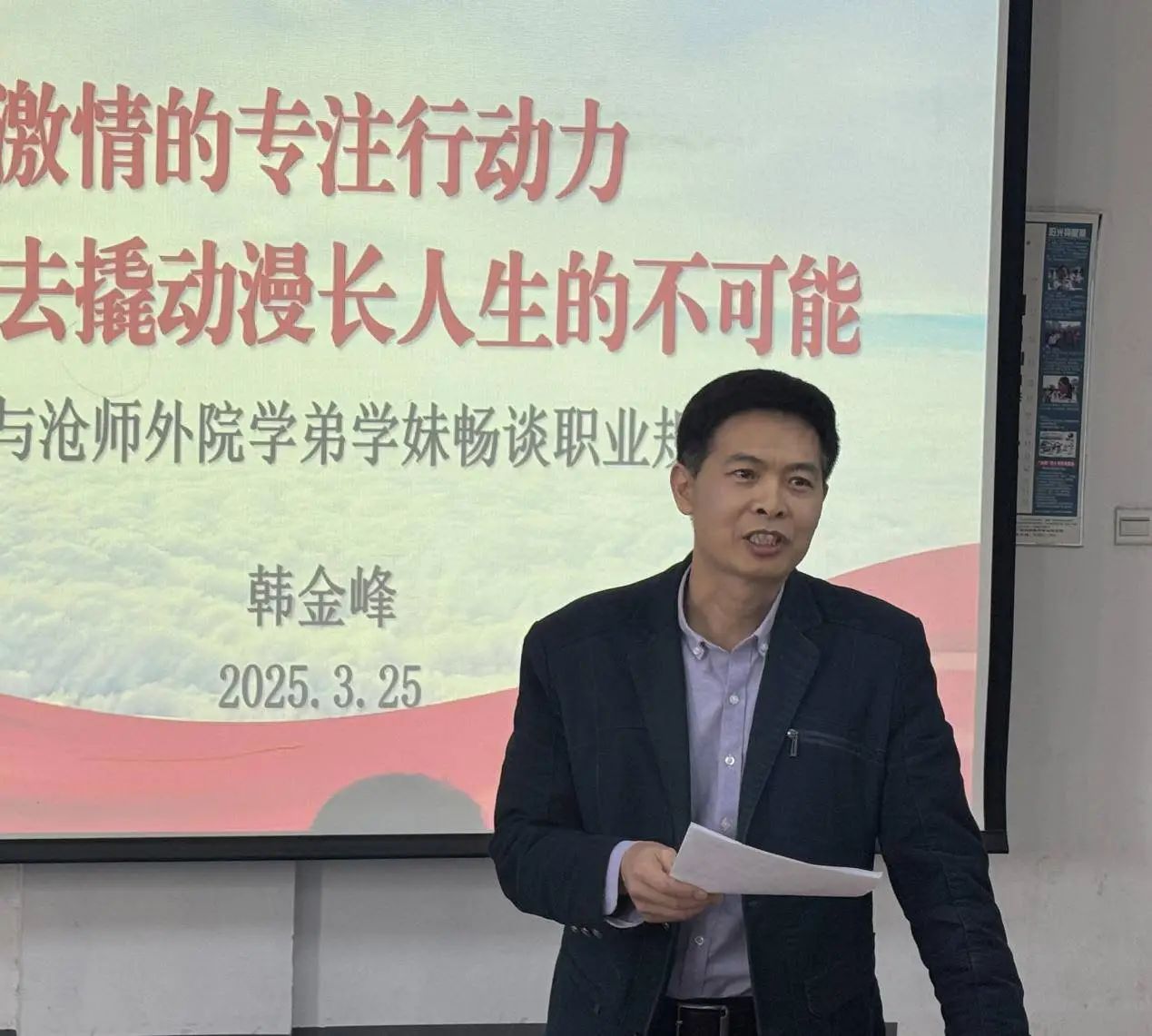 3月25日下午,外国语学院特邀优秀毕业生、现黄骅市第五中学校长韩金峰作职业生涯规划讲座。外国语学院副院长徐广林主持。