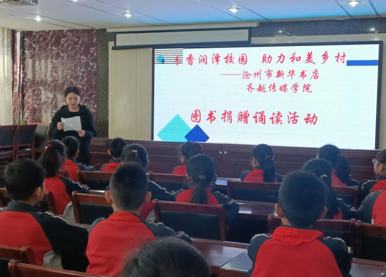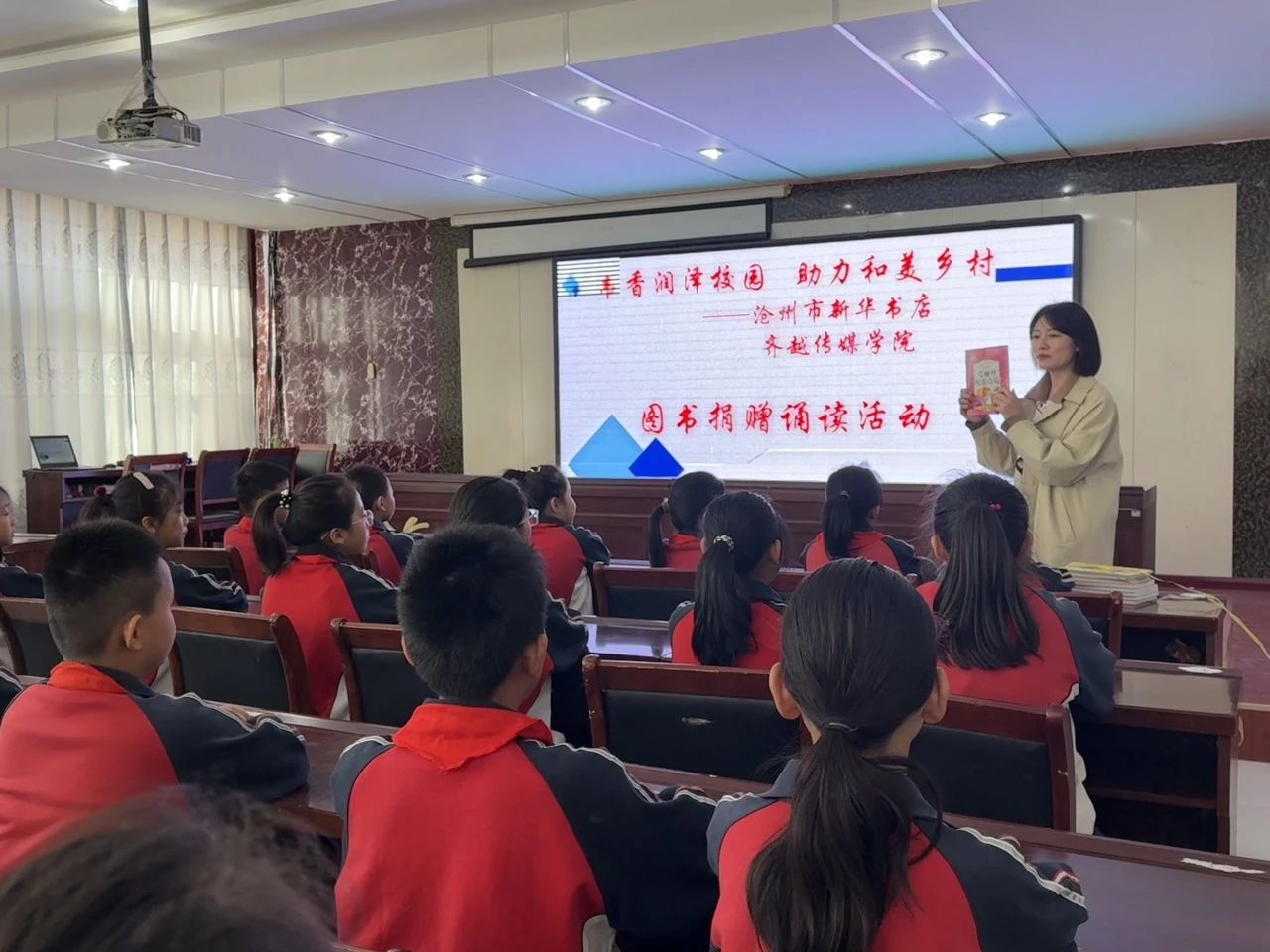 沧州市新华书店与齐越传媒学院联合向吉庆学校捐赠图书,赵国良表示,沧州市新华书店将以文化助力乡村教育,点亮孩子们的阅读梦想。齐传学子发挥专业特色,为吉庆学校师生们绘声绘色地朗读了捐赠图书中的章节。安琪结合学子领读内容,鼓励小学生们不忘历史,心怀感恩,珍惜时光,好好读书。