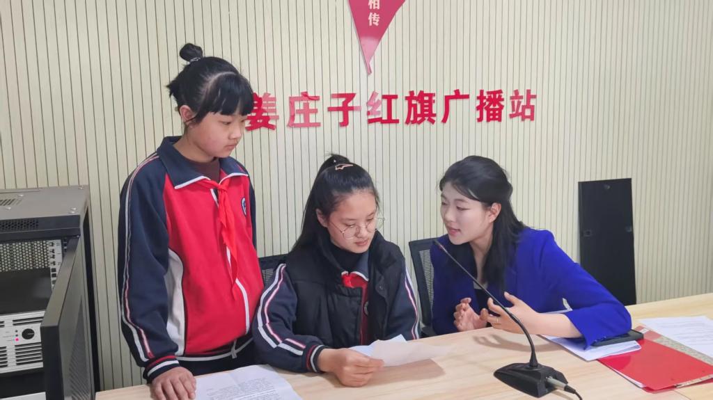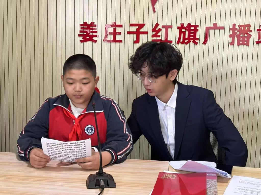 在“齐越红旗广播站”,齐越传媒学院师生与姜庄子村吉庆小学学生开展“大手拉小手”广播实践,张海燕等专业教师指导“齐越班”学生代表带领吉庆学校的小学生学习播音技巧,播读了有关乡村振兴、建设和美乡村的文章,通过“红旗广播”向乡亲们传达了党的声音和国家政策。