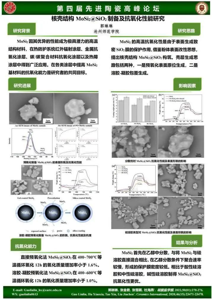 郭琳琳在论坛上交流了“核壳结构MoSi₂@SiO₂制备及抗氧化性能研究”的阶段性成果,该研究针对MoSi₂材料在高温环境下的氧化问题,提出通过直接预氧化法和溶胶-凝胶预氧化法构建核壳结构MoSi₂@SiO₂,显著提升了MoSi₂材料的抗氧化性能,这一成果为高性能辐射式热防护涂层和抗氧化涂层的研究提供了助力。