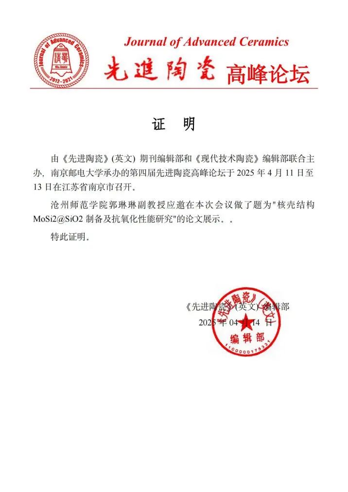 4月11日-13日,新葡萄官网化学与化工学院教师郭琳琳和毛羽丰受邀参加了在江苏南京召开的“第四届先进陶瓷高峰论坛”。本届论坛由《Journal of Advanced Ceramics》与《现代技术陶瓷》期刊编辑部联合主办,聚焦先进陶瓷领域的最新研究成果与技术进展,吸引了众多国内专家学者、工程技术人员及研究者参与。《Journal of Advanced Ceramics》是由教育部主管、清华大学主办、清华大学出版社出版的国际学术期刊,期刊2023年影响因子为18.6,在材料科学领域处于国际领先水平,连续四年在SCI“材料科学:陶瓷”分类期刊中排名第一。