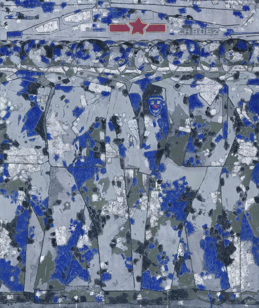 这幅作品采用迷彩色块叠加的形式,以蓝灰为主色调,结合抽象与具象的表现手法,展现了队列行进的军人形象。画面中红色五角星与军徽标志成为视觉焦点,象征着忠诚、荣誉与使命。灰蓝相间的色块不仅表达了军装的统一性,也烘托出军队秩序与纪律的庄严感。作品通过模糊的人物轮廓与抽象的细节,表现出个体在集体中的隐匿与融合,传递出“集体意识高于个体”的主题。这幅作品不仅是一种对军人精神的致敬,更蕴含着对秩序、力量与责任的思考。