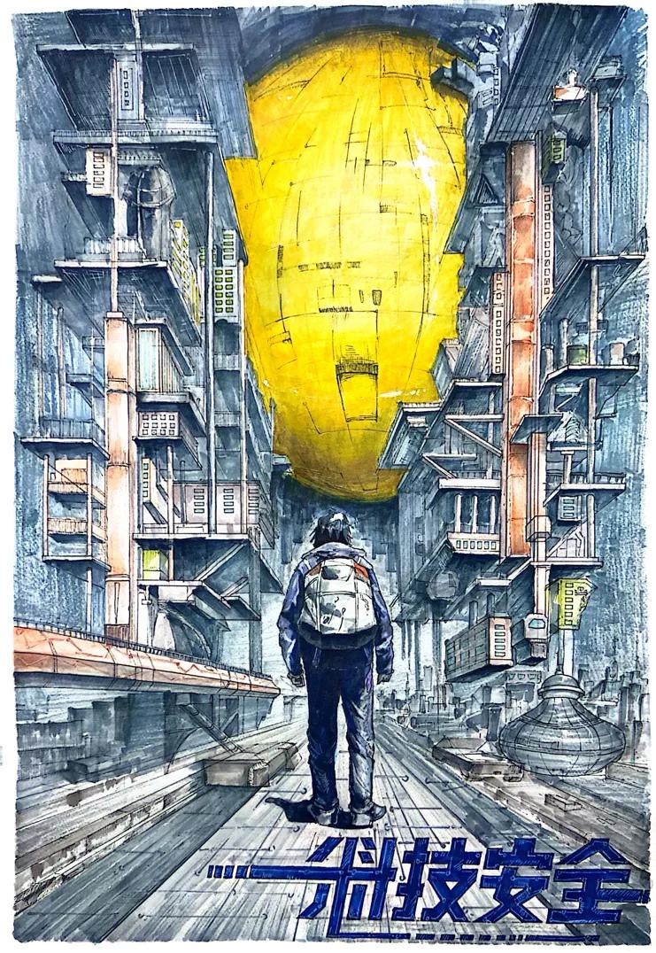 海报围绕“科技安全”这一主题展开,旨在强调科技安全对国家、社会及个人的重要性,唤起大众对科技安全的关注与重视。海报的造型寓意守护,突出科技安全在保障信息、技术等方面的关键作用。背景是浩瀚宇宙星空与城市夜景相互融合的奇幻场景。宇宙和城市夜景则象征人类社会的发展与进步海报以科技蓝为主色调,蓝色代表着冷静、理性与深邃,契合科技领域的特质,同时也给人一种引导观众积极参与到维护科技安全的行动中来。