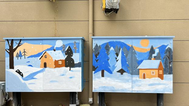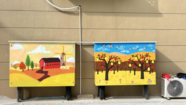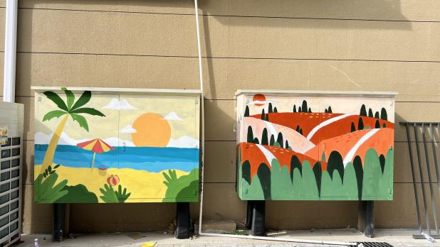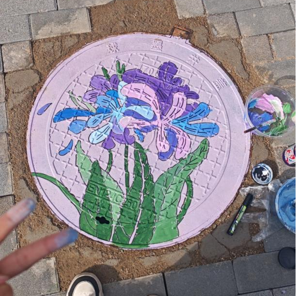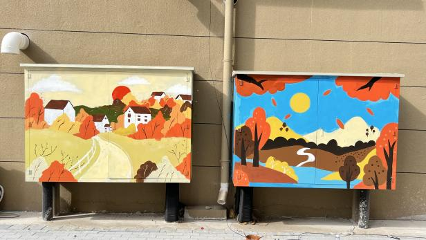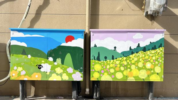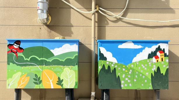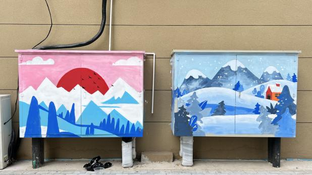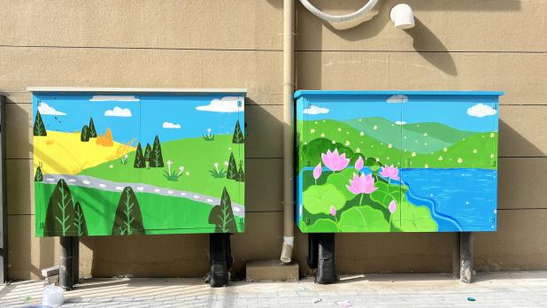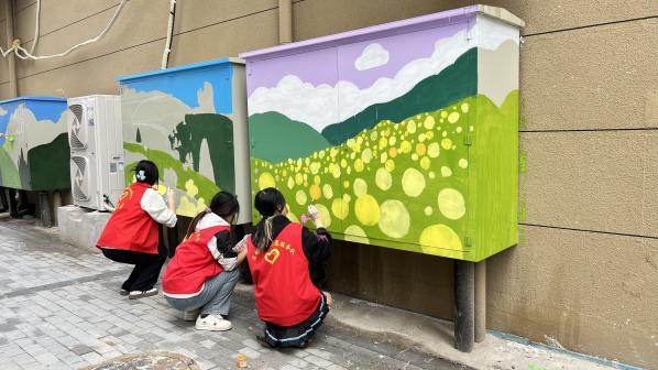 在活动的现场,同学们以专业的视角丈量社区的空间,用创意构思,勾勒出四季的轮廓。鲜明的色彩对比与细腻的笔触交织,让原本冰冷的金属箱体和水泥井盖化作承载季节韵律的艺术载体。同学们分工协作,调色勾线,历经数小时沉浸式的创作,一幅幅充满诗意的作品,次第亮相,引得路过的居民纷纷打卡拍照。对同学们而言,户外墙绘既是专业能力的练兵场,更是服务社会的试金石。在户外创作需要考虑色彩的耐久性构图等现实因素和课堂的作业完全不同当看到自己的作品被居民认可,才真正理解艺术源于生活服务生活的含义。