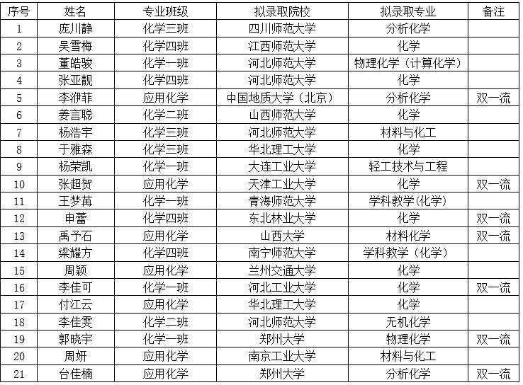 少年当立鲲鹏志,勇毅前行闯新天。在2025年全国硕士研究生招生考试中,化学与化工学院学子再传捷报,续写辉煌!截至目前,化学与化工学院2025届毕业生共有51名同学金榜题名,其中12人考入211院校,17人被“双一流”建设高校录取,5人被“双一流”建设学科录取。这一份份沉甸甸的录取通知书,见证了同学们日夜兼程的拼搏,也彰显了化学与化工学院人才培养的突出成果!
