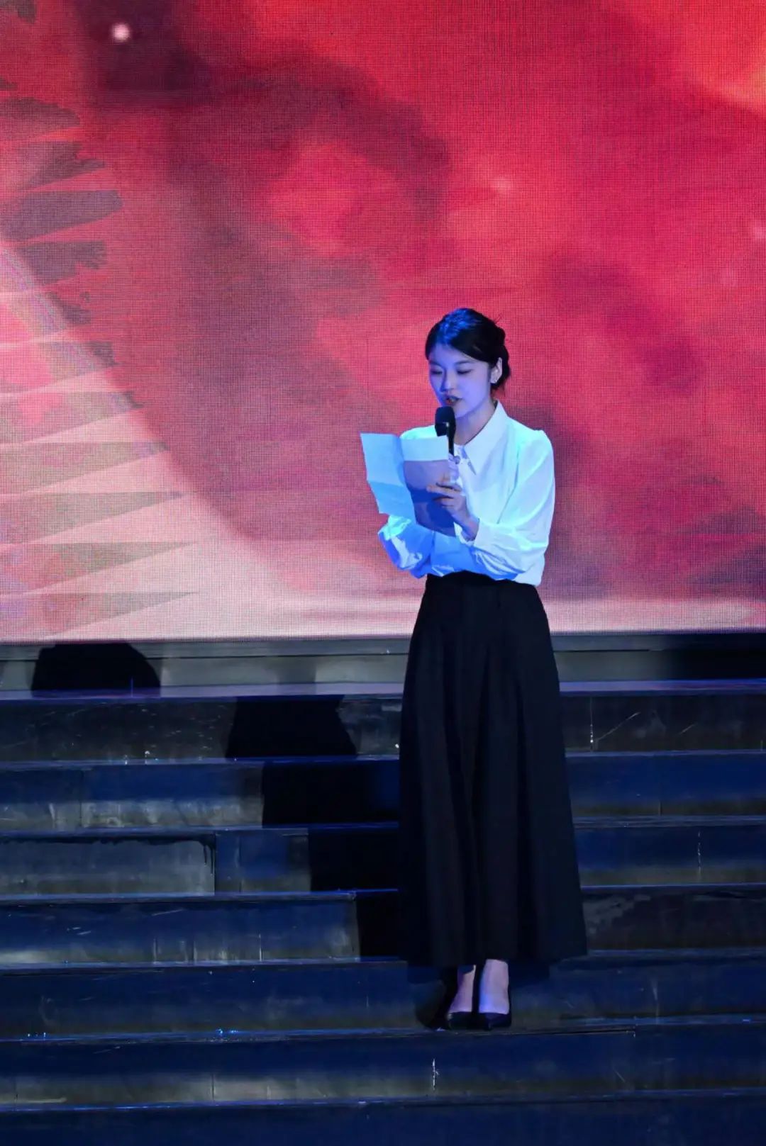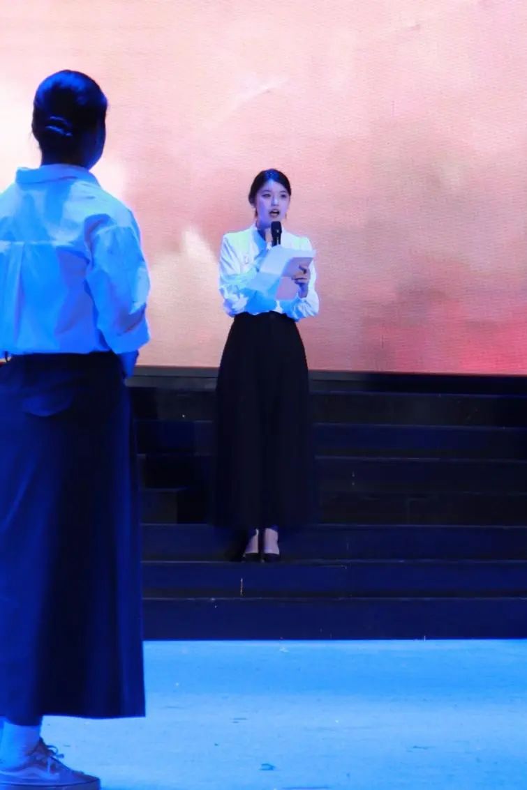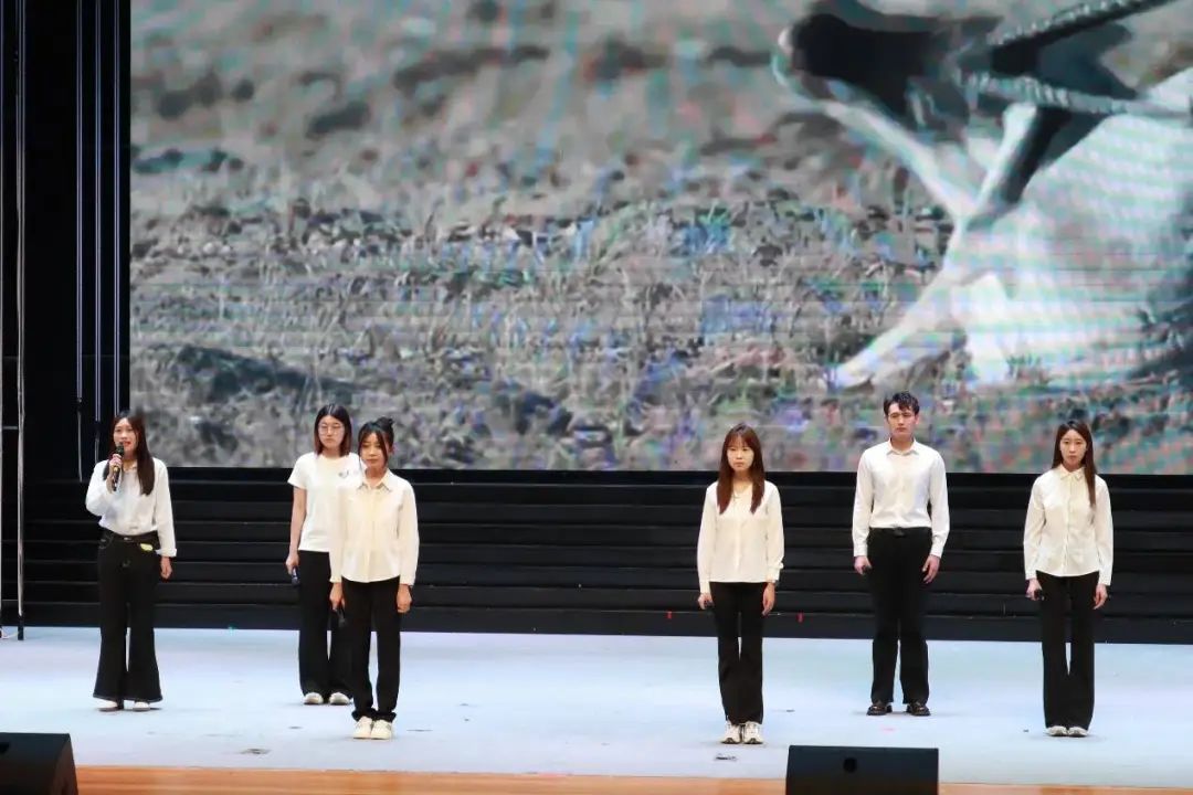 在“烽火岁月·苦难与抗争”篇章中,《我用残损的手掌》以低沉婉转的语调,诉说国土沦陷的悲怆;《雪落在中国的土地上》饱含深情,将诗人对祖国的眷恋与对侵略者的愤恨化作字句流淌。最令人动容的《最后一只藏羚羊》,通过独特的生态视角,展现战争对生命与家园的摧残,让观众深刻体会到和平的珍贵。而《战地播报》的情景主持,逼真还原了战地记者在枪林弹雨中传递信息的惊险场景,让现场师生仿佛亲临战场,感受到战争的残酷与人性的坚韧。
