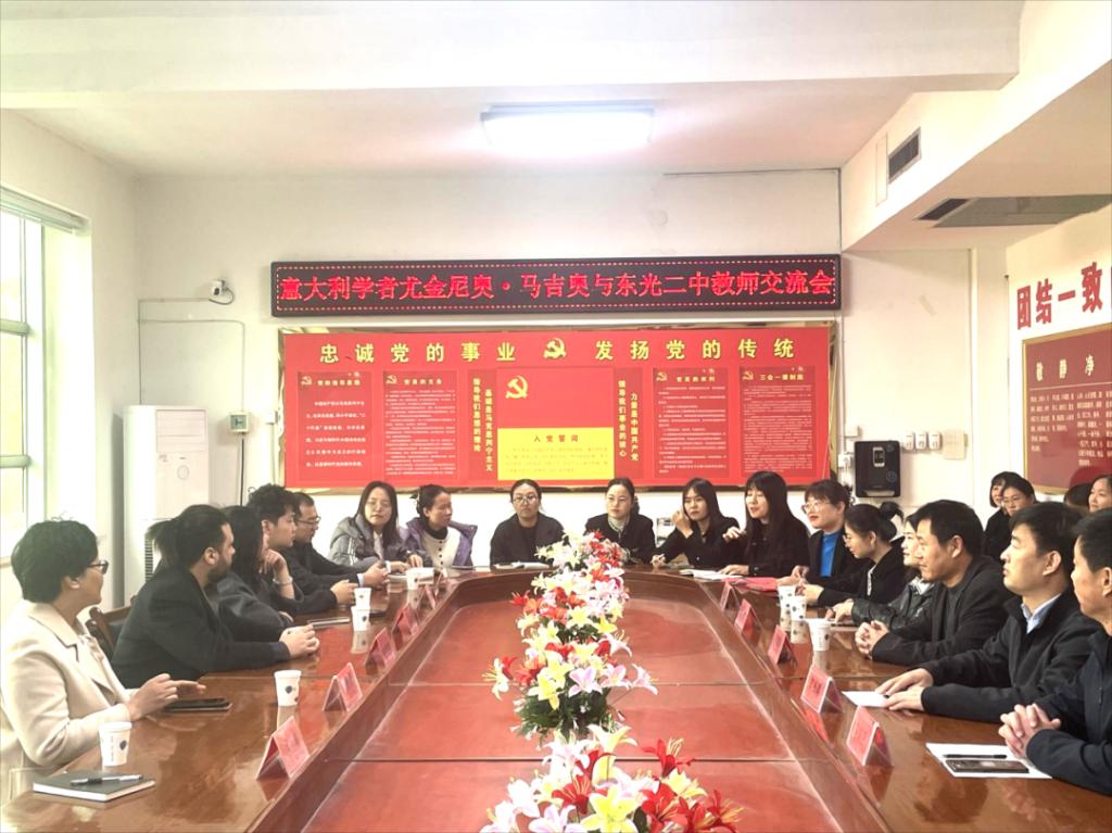 来宾与东光二中全体英语老师进行了座谈交流。双方就初中生英语学习、两国文化等话题展开热烈交流,尤金尼奥·马吉奥(Eugenio Maggio)分享了学习和教授英语、意大利语、法语、德语等多国语言的经验。