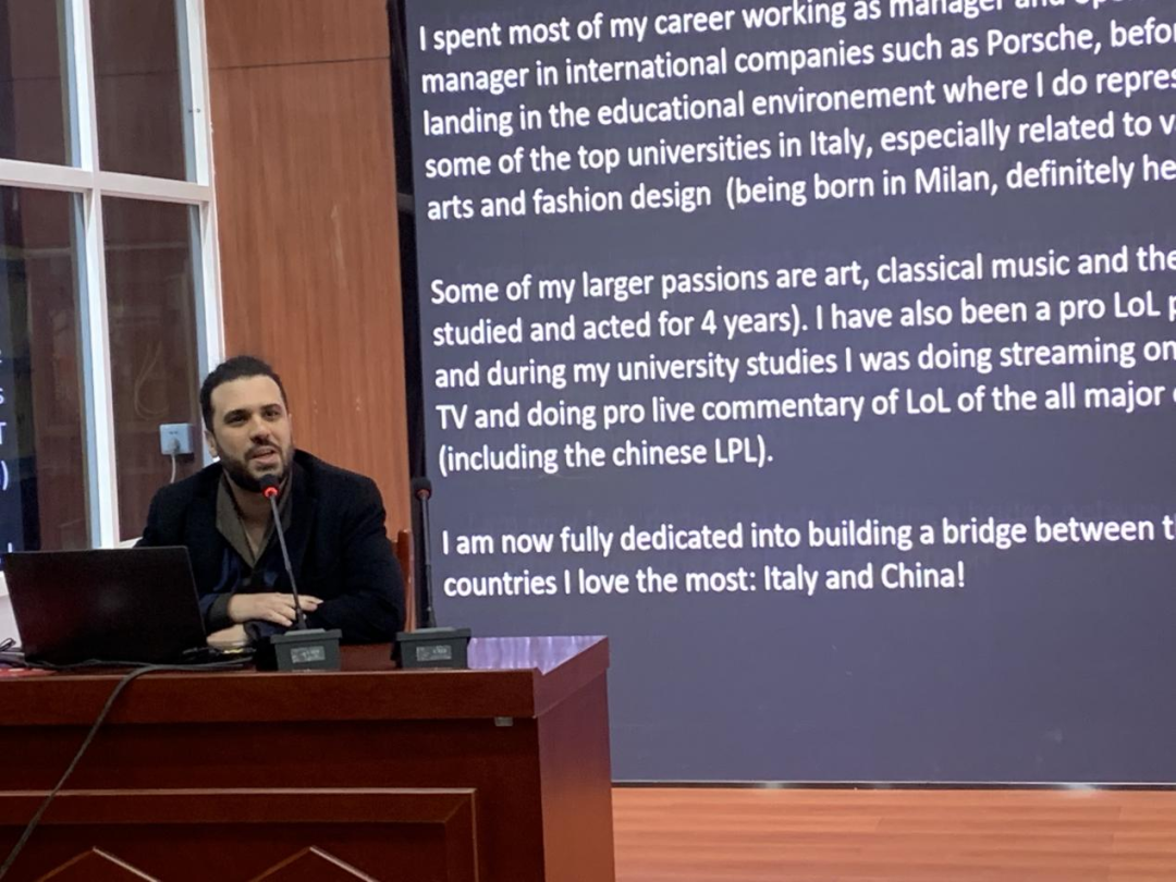Eugenio Maggio在大会议室与初中生进行了互动交流。他介绍了自己在意大利和中国的学习和生活经历,让现场师生对意大利文化、风土人情、学校及学生生活有了更多了解。Eugenio Maggio表示自己非常喜欢中国文化,学生们也怀着强烈的好奇心,争相发言提问,展现了良好的自信和英语功底。