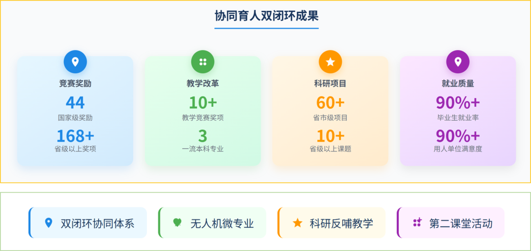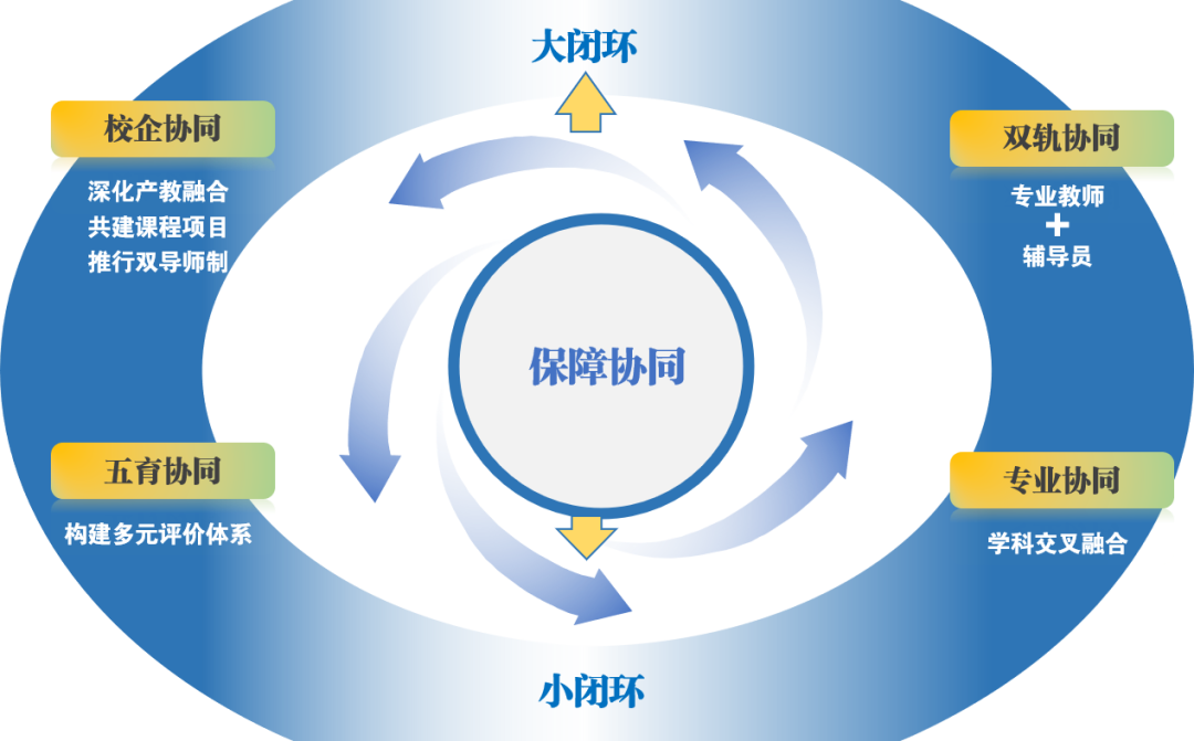 校企协同:共建实训项目,推行毕业实习/毕业设计 “双导师制”;双轨协同: “专业教师 + 辅导员” 双轨指导,融合学术与职业培养;五育协同:将德育、美育、劳动实践等第二课堂纳入学分,构建多元评价;专业协同:联合开设无人机微专业,跨学科整合课程与师资;保障协同:建立 “校 - 家庭- 社 - 企” 大闭环(需求对接→过程监控→成效反馈)与 “校 - 院 - 室 - 生” 小闭环(四级管理体系),保障教学质量持续优化