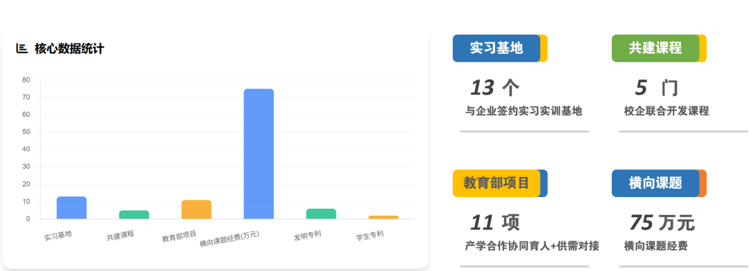 以“双三四共” 协同育人模式为核心,建成 13 个实习基地与大数据产业学院,校企联合开发课程 5 门、申报教育部项目 11 项,获河北省教学创新大赛产教融合赛道一等奖;横向课题经费达 75 万元。