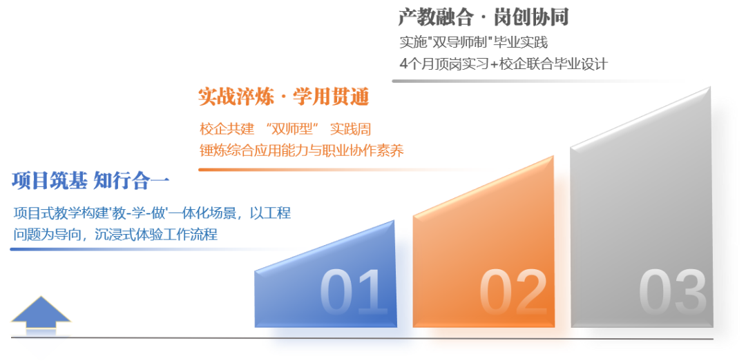2. 构建 “三阶递进”实践体系。以能力进阶为逻辑:第一阶梯 “项目筑基,知行合一”,以项目式教学融合“教—学—做”,通过工程问题实训,培养系统思维与工具应用能力;第二阶梯 “实战淬炼,学用贯通”,校企共建实践周,引入企业真实案例与工程师驻校集训,强化综合应用与协作素养;第三阶梯 “产教融合,岗创协同”,实施 双导师制,结合毕业顶岗实习与联合毕设,贯通研发至产品全周期,锻造岗位胜任力与创新潜能。