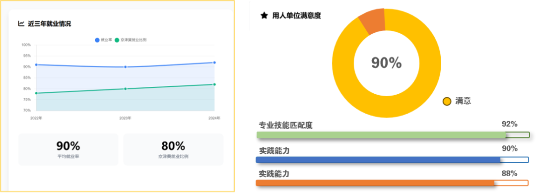 学生近三年就业率一直稳定在90%以上,其中80%入职京津冀相关专业企事业单位,区域服务能力显著增强。用人单位整体满意度在90%以上。