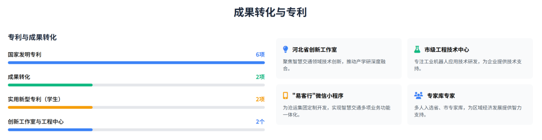 完成“易客行” 智慧交通系统等技术转化,教师获国家专利 6 项(2 项成果转化),学生参与企业项目超 50 人次。