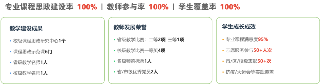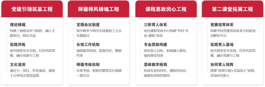 建成“四个工程” 全链条育人体系,实现课程思政、教师参与、学生覆盖 100%,荣获省级教学比赛奖项 3 项、课程思政示范课 6 门等荣誉奖项;打造 “红色代码” 编程竞赛等品牌活动,学生专业认同与实践能力显著提升,形成“经师”“人师”统一的育人闭环。