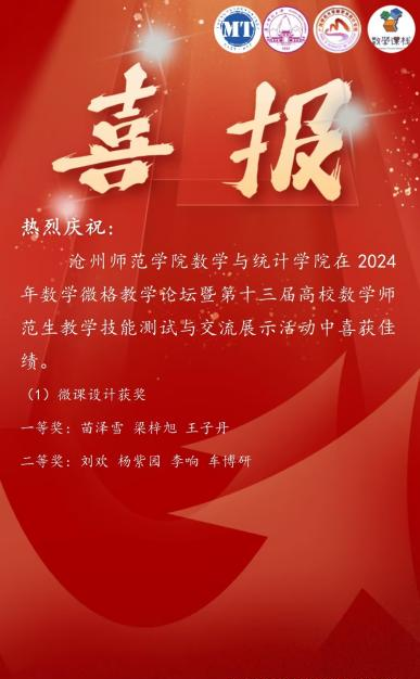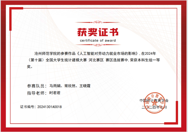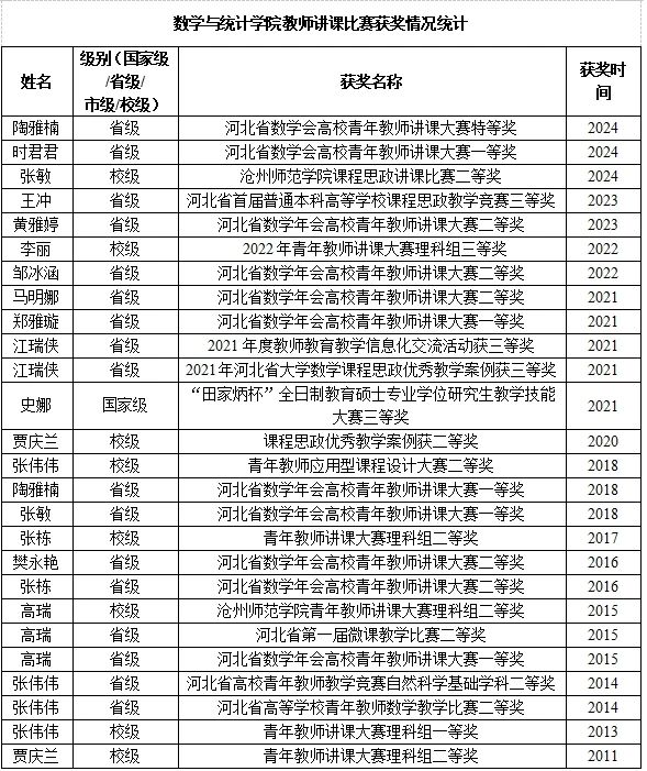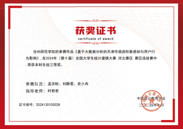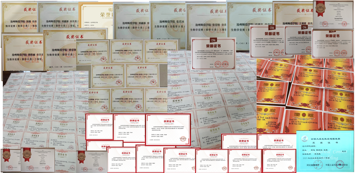 (1)组建建模团队,积极开展教学和学科竞赛融合育人模式。近年来,学院整合优秀师资力量,组建“数学与统计学院建模工作室”,指导学生参加全国大学生数学竞赛、全国数学建模竞赛、全国市场调研大赛以及统计建模比赛等学科类竞赛,多次获得优异成绩,2023年在全国大学生数学竞赛中获得好成绩,获奖等级数量均超过省内同类院校;2023年9月份在全国数学建模竞赛河北省赛区比赛中取得省级一等奖的好成绩。2025年在第十五届全国大学生市场调查与分析大赛中,荣获国家三等奖。