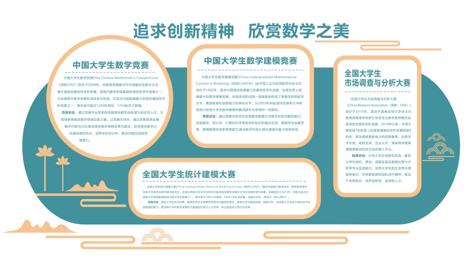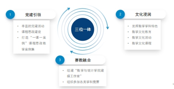 在“师资队伍、实践环节、课堂活动”的保障下,形成了“党建引领、文化浸润、教赛融合”的育人模式,即“党建引领育人方向,数学文化浸润育人过程,教赛融合搭建育人通途”。