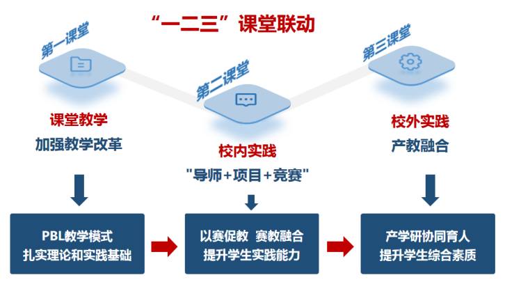 将创新精神和实践能力贯穿于从学生入学到毕业的学习过程;将企业资源和毕业生资源融入教育教学过程中;通过课程实验、小项目实践和专业见习实习研习,理实协同,产教协同、政教协同、师学协同培养模式,构建“三纵四横”协同育人体系。