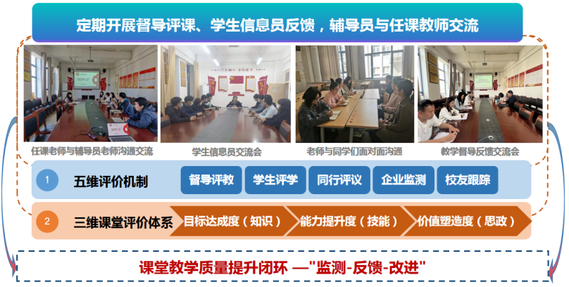 持续改进阶段,建立“五维评价”反馈机制。学院通过定期开展督导评课、学生信息员反馈,辅导员与任课教师交流等举措,构建“督导评教+学生评学+同行评议+企业监测+校友跟踪”五维评价机制,构建“目标达成度(知识)、能力提升度(技能)、价值塑造度(思政)”的三维课堂评价体系,建立“监测-反馈-改进”的课堂教学质量提升闭环。