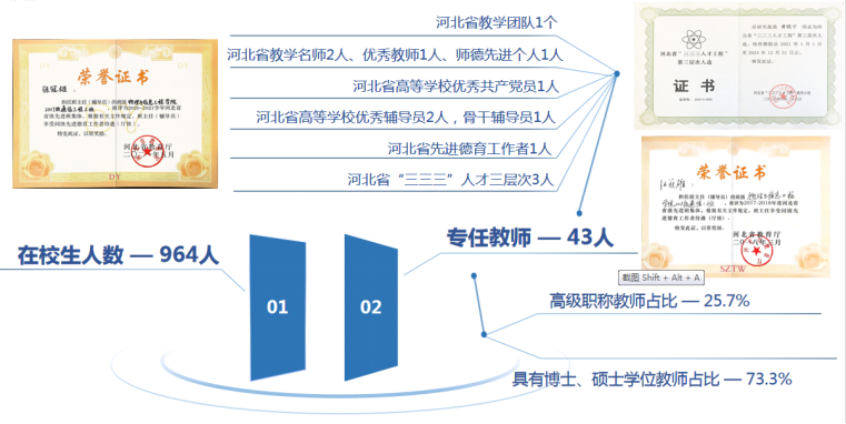 在校生964人,专任教师43人,河北省教学团队1个,河北省教学名师2人,河北省优秀教师1人,河北省师德先进个人1人,河北省高等学校优秀共产党员1人,河北省高等学校优秀辅导员2人,河北省先进德育工作者1人,河北省骨干辅导员1人,河北省“三三三”人才三层次3人。