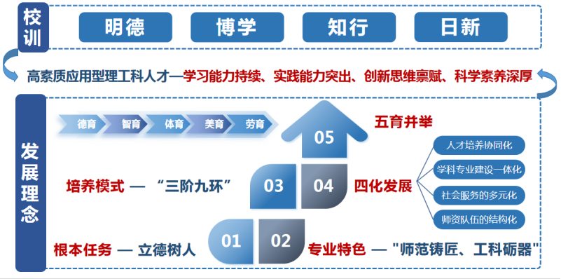 学院秉承“明德 博学 知行 日新”的校训精神,践行“12345”发展理念,以立德树人根本任务,形成“师范铸匠、工科砺器”的专业特色,以“三阶九环”培养模式,坚持四化发展,五育并举,致力于培养“学习能力持续、实践能力突出、创新思维禀赋、科学素养深厚”的高素质应用型理工科人才。