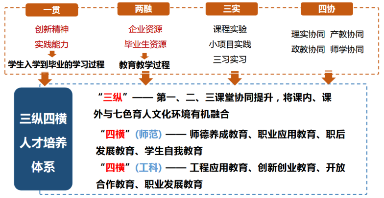 推进一、二、三课堂协同提升,将课内、课外与七色育人文化环境有机融合,一体化构建“复合式”学生知识结构,多举措深化“启发式”学生思维培养,全方位加强“自觉式”学生文化熏陶,实现学生能力纵向提升。针对师范类专业“四横”是从师德养成教育、职业应用教育、职后发展教育、学生自我教育四个方面横向提高学生综合素质;针对工科类专业“四横”就是从工程应用教育、创新创业教育、开放合作教育、职业发展教育四个方面横向拓展多元有效的教学方法和教学载体,发挥产业、学科、专业叠加优势,通过与中小学、行业企业共同修订培养方案、共建专业导论课程、共建产学研基地、共同指导学生专业竞赛、开展教学实践周活动、指导学生毕业实习和毕业论文(设计)等,切实提升应用型人才培养质量。