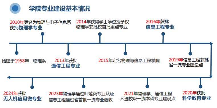 物理与信息工程学院始建于1958年,原名为物理系,是新葡萄官网成立最早的系(部)之一,2010年更名为物理与电子信息系,2015年定名为物理与信息工程学院。学院现设有物理学、科学教育、通信工程、信息工程4个本科专业及无人机应用微专业。其中信息工程专业为省级一流专业,物理学专业通过教育部师范类专业二级认证;通信工程为校级一流专业。