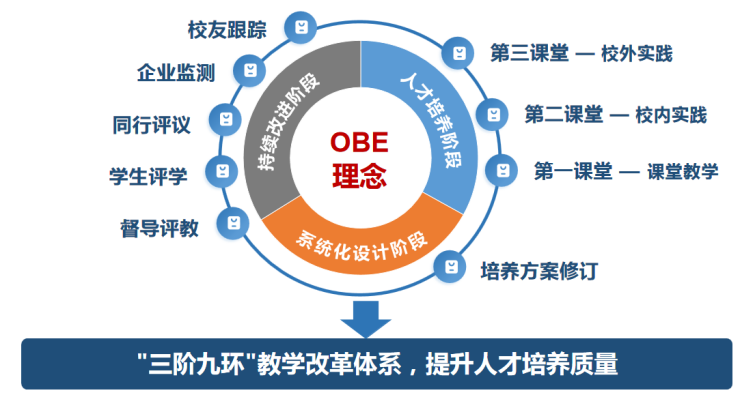 基于OBE理念,构建系统化设计阶段,人才培养阶段,持续改进阶段“三阶九环”教学改革体系,提升人才培养质量。