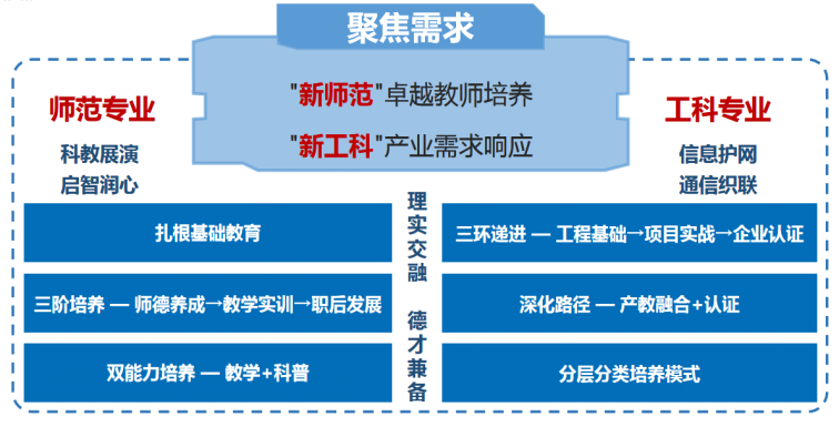 聚焦“新师范”卓越教师培养和“新工科”产业需求响应,坚持理实融合、科教融合、产教融合“三融合”,打造以物理学、科学教育铸就师范品牌,用信息工程、通信工程服务数字社会的专业特色,形成“物理师范,格物育人;科教展演,启智润心;信息护网,通信织联;理实交融,德才并兼”专业布局。师范专业扎根基础教育,实施“师德养成→教学实训→职后发展”三阶培养,强化“教学+科普”双能力培养;工科专业推行“工程基础→项目实战→企业认证”三环递进,对接信息通信产业,深化“产教融合+认证”路径,形成分层分类培养模式。